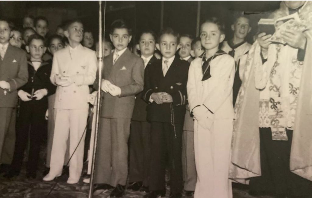 En aquesta imatge no hi surt ella però sí el seu germà. És del dia que va fer la Primera Comunió. El capellà que es veu tallat és el Rector d’aquells anys, Mn. Ramon Rota Canal.