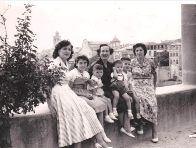 Cal tenir una ceta edat per recordar aquestes dues mestres del Col·legi Jaume Balmes que van ser molt populars entre la mainada. La de l’esquerra és la “senyoreta Nati” que tenia cura dels més petits i que tothom estimava pel seu bon caràcter i manera de tractar els alumnes. La del mig, també mestra del mateix centre, és la “senyoreta Casilda”. Tenien molta amistat amb “Paquita de la Perfumeria” que les acompanya. És la de la dreta. Els tres fills, la Conxita i els nens estan també a la fotografia. Hi ha un tercer nen que no identifico.