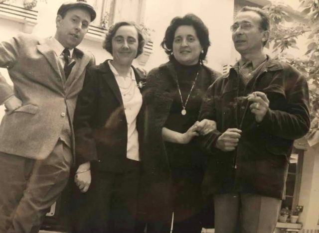 Amics i veïns. D’esquerra a dreta, Pere Bescós. Al costat la seva esposa, M. Tresa, posen amb el matrimoni Camacho Altisent. Els primers van tenir cura d’una fàbrics de gorres ben important que donava feina a un grup de gent força nombrós.