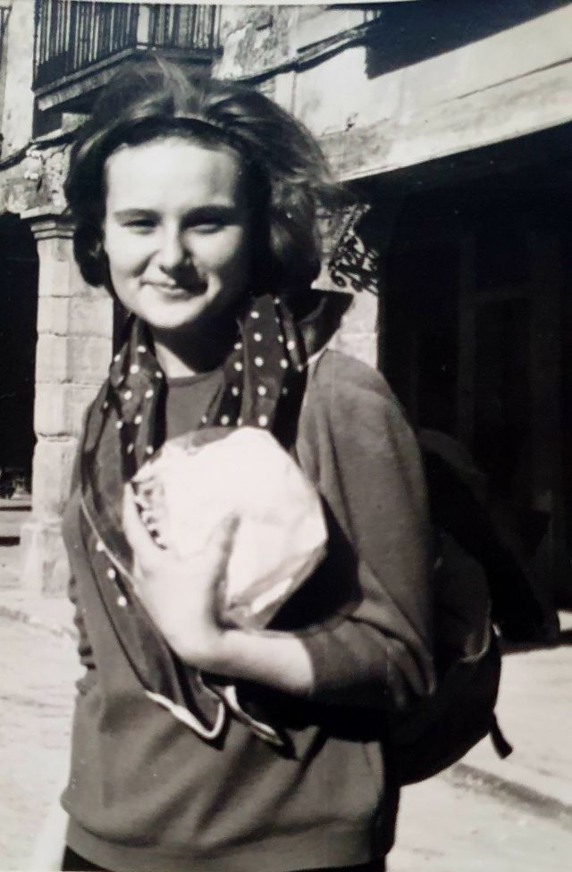 Aquesta fotografia, feta a la plaça Major en la que porta una motxilla a l’esquena, deu estar feta abans de iniciar la marxa cap a Montserrat a peu. Porta un jersei que s’assembla una mica a una dessuadora i un mocador al coll que li dóna gràcia.