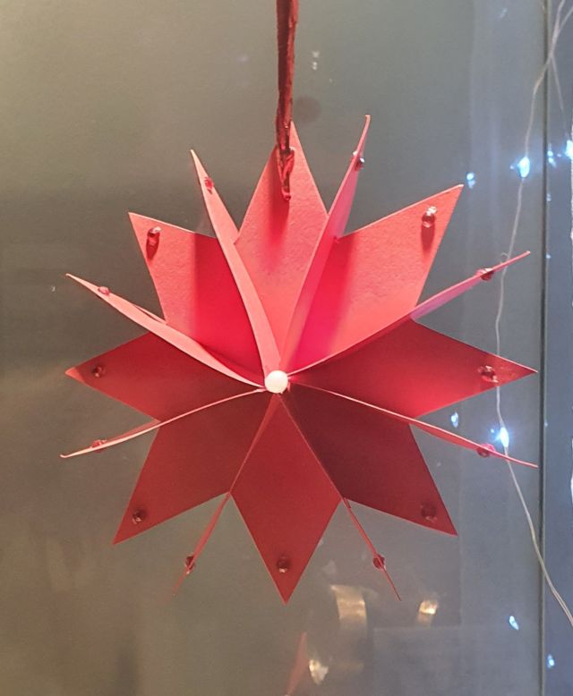 Detall d’una estrella muntada a mà i decorada amb petits elements del mateix color.