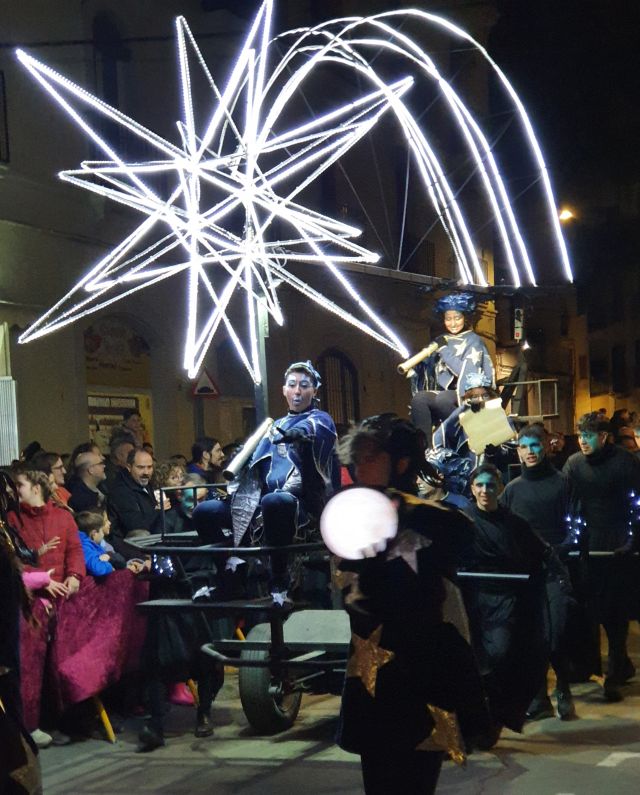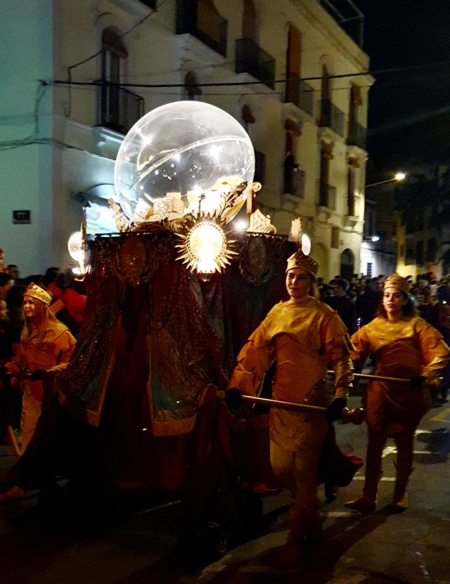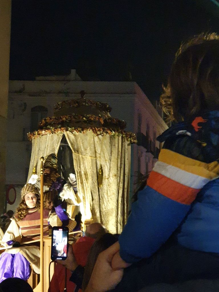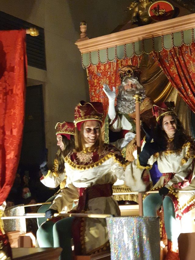 Jo vaig tenir la sort de veure la cavalcada a Vilanova i la Geltrú que, tot i que amençava pluja no va arribar a caure a la ciutat sinó als afores. L’arribada dels reis és molt curiosa ja que se’ls veu caminant. Aleshores pugen a una tarima i, des d’allí, van veient la desfilada de carrosses, que són ben maques. Al final, arriben les seves precedides d’unes que porten or, incens i mirra. Cadascun d’ells puja a la seva carrossa i fan el gran recorregut pels llocs mès cèntrics de la ciutat.