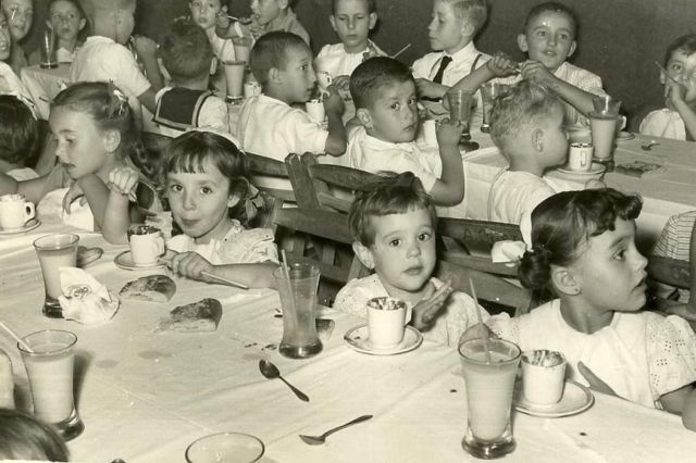 En aquest cas i, també aplegats al voltant d’una taula, ens trobem amb una colla d’infants que sembla que mengin coca de sucre amb xocolata desfeta. El berenar es feia a la rebotiga de la Farmàcia Civit i estaven convidats per celebrar el naixement de la primera filla, Concepció Civit Fontova.