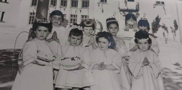 Corpus era una diada molt celebrada. Podeu veure al fons la façana del Col·legi Jaume Balmes, que sempre ha tingut fama d’embellir-la amb decoracions variades, com llueix en aquest festa. També s’hi posava, a l’entrada del centre, un altar on es parava la custòdia en el moment que la processó passava per aquí. Hi havia el costum de vestir d’angelets una colla de nenes que es posaven a ambdues bandes de les escales tocant a l’altar.