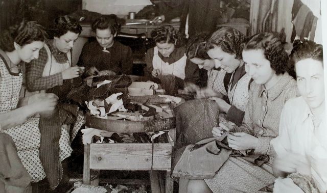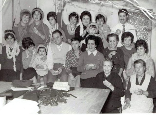 Aplegades/ts al voltant del vetllador, una taula de fusta que es trobava a la majoria de cosidors i que servia per guardar els estris de cada treballadora/or, podem veure d’esquerra a dreta, Maria Morros, Maria Cardona Núria Pifarré, casada amb Agustí Castellà i mare de molts fills, Antònia Solé, Trini Rubinat, Consuelo Trilla, Teresina Botines i Ramon, un jove de Granyena.