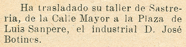 Un escrit a la premsa informant de l’obertura de la primera Sastreria Botines que va obrir les seves portes al carrer Major número 32.