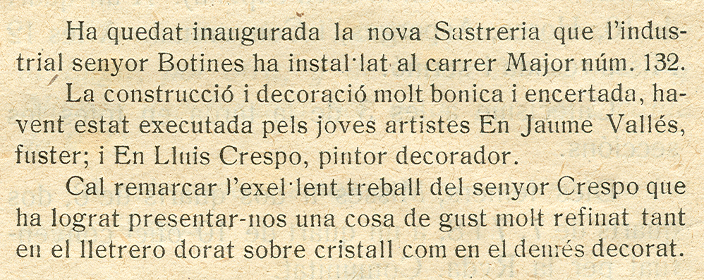 Nota de premsa que explica el ben decorada que estava la nova botiga situada als baixos d’un edifici del carrer Major que Josep Botines comprà.