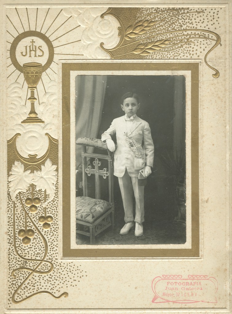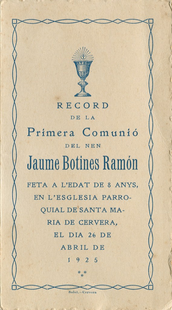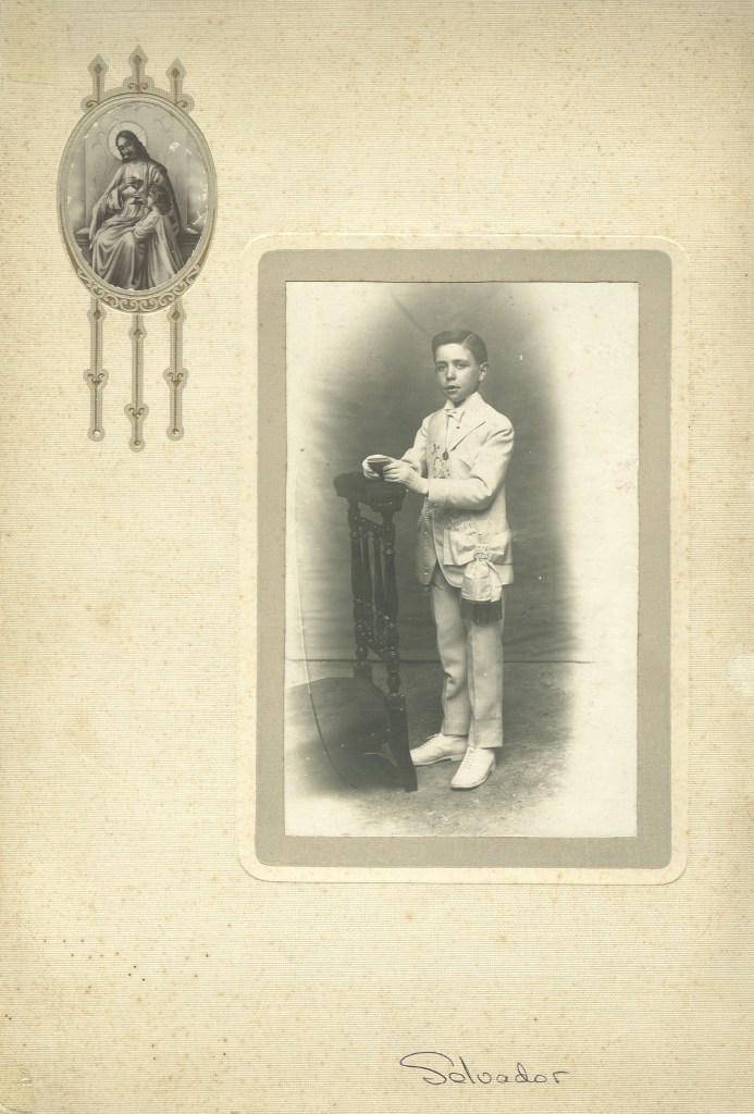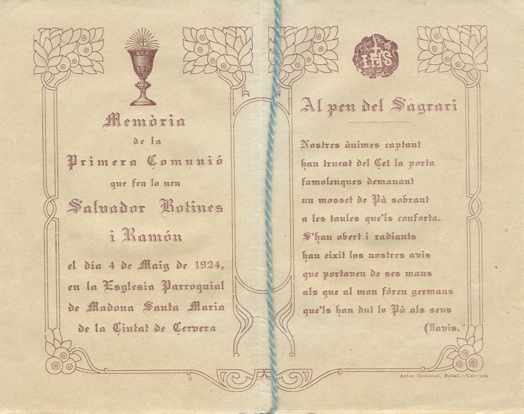 Salvador, que és el gran, va fer la Primera Comunió l’any 1924. Aquest és el bonic recordatori que van encarregar a “Artes Gráficas Salat” com es llegeix en la lletra petita.