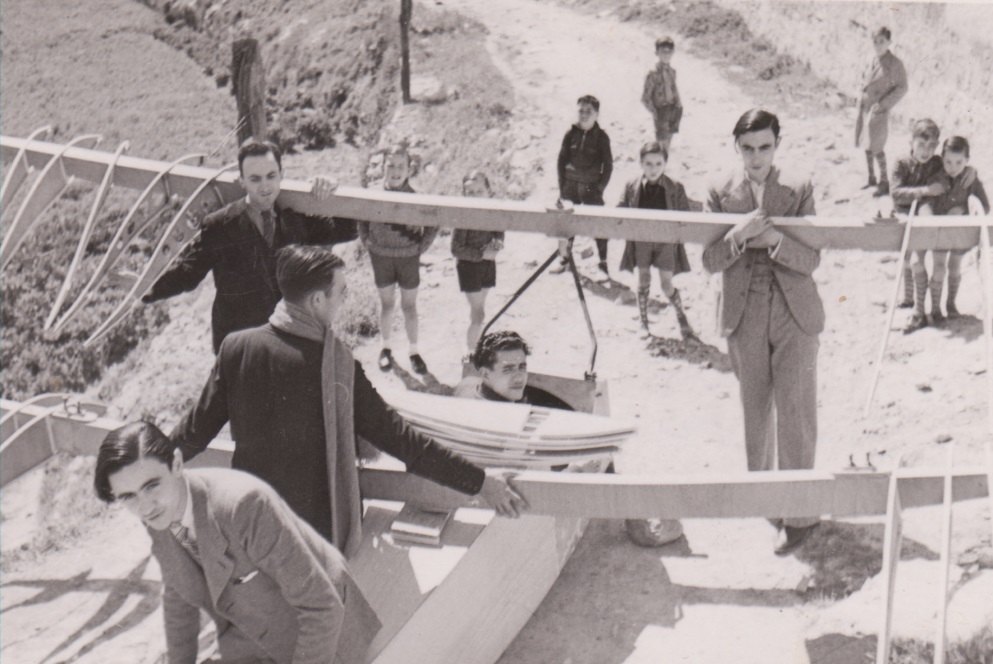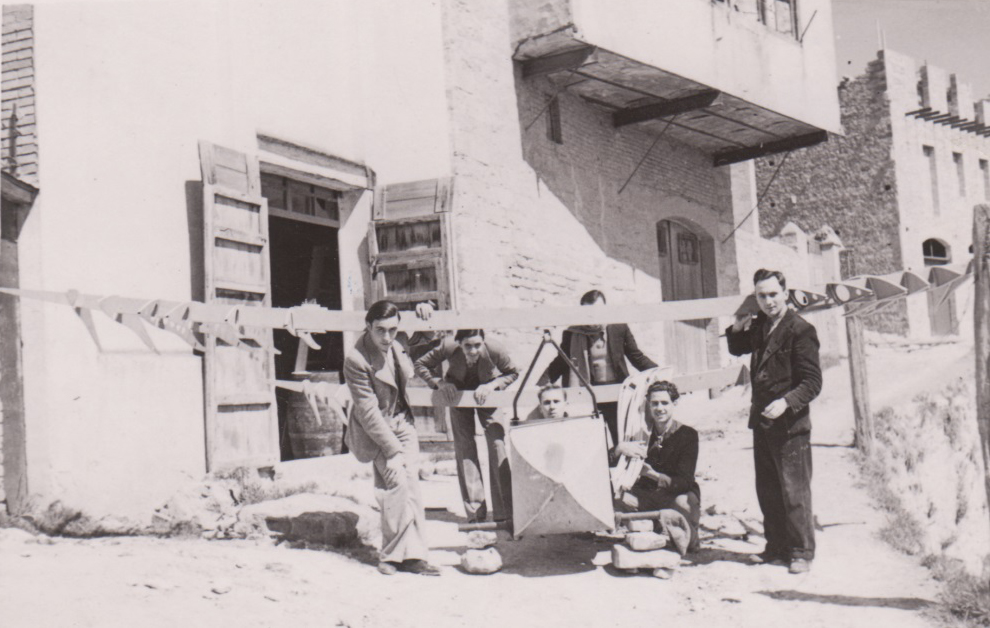 Aquí els podeu veure tots dos ajudant a la construcció del Poll del Cel, el famós avionet que una colla de cerverins van muntar. Jaume i Salvador botines són els dos joves de l’esquerra.