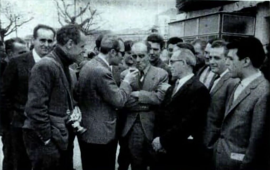 L’acompanyen, d’esquerra a dreta, Ton Puig, Josep Serés, el periodista gravant la conversa amb Antoni Bové, entre ells dos i al darrere, Ramon Rauret, un dels germans Castellà, de perfil Ramon Royes, Llorenç Boldú, Josep Bernaus i Josep Bellaubí.