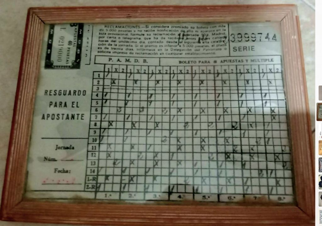 Y me enseña el resguardo, número 3.999.774, timbrada con 40 pesetas. Es una quiniela simple de ocho columnas. Hay seis resultados fijos, y que corresponden a los partidos Granada-Bilbao, Zaragoza-Córdoba, Málaga-Español, At. de Madrid-Real Sociedad y Ferrol-Alcoyano.