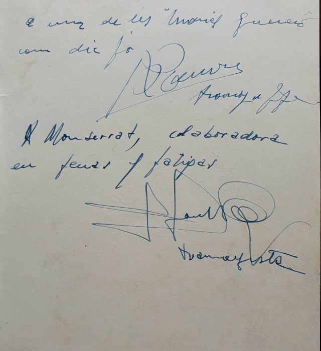 A la darrera pàgina, davant la contraportada, encara hi ha un parell de dedicatòries escrites amb aquell tipus de lletra que en diem de “metge”. Costa d’entendre. La darrera, amb una signatura impossible, està escrita en castellà.