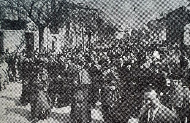 Sembla que van ser rebuts per molta gent i, com era habitual en aquell temps, no hi faltava la guàrdia civil. Al fons, es veu el Col·legi Jaume Balmes.