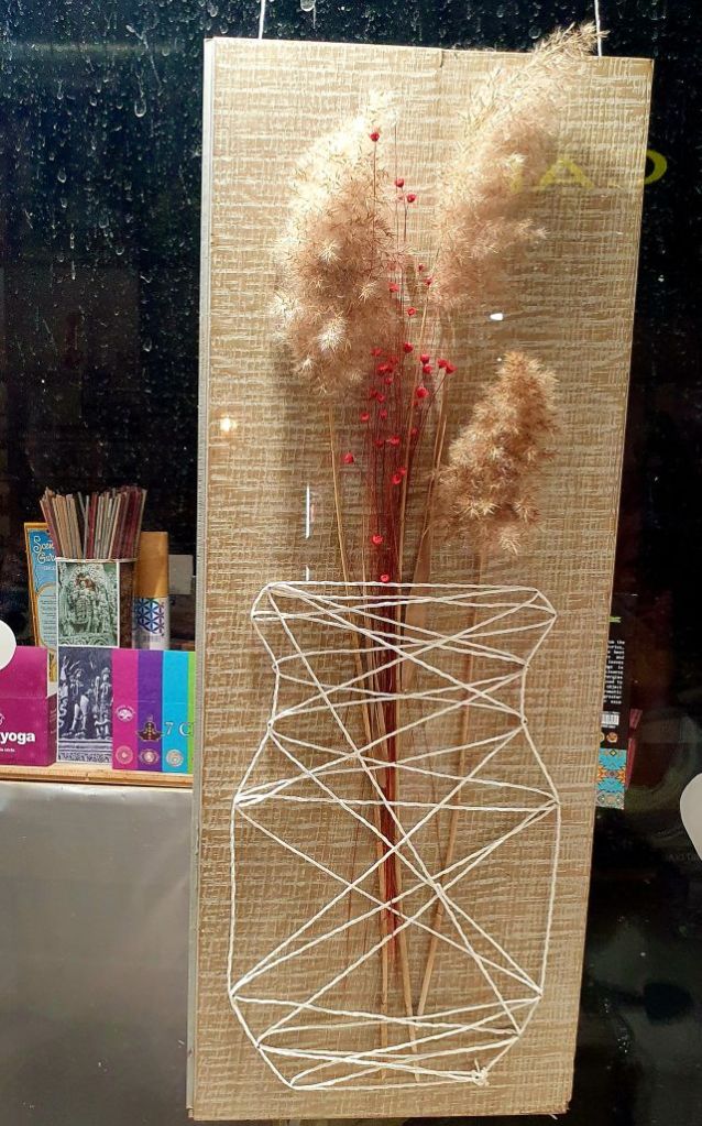 Jo penso que aquest aparador nadalenc de l’any 2023 és el més maco que ha fet mai. Vells finestrons, tancats amb tela de galliner, fan de suport a diferents tipus de flors que formaven part d’un ram que li van regalar en motiu de la celebració d’un aniversari.
