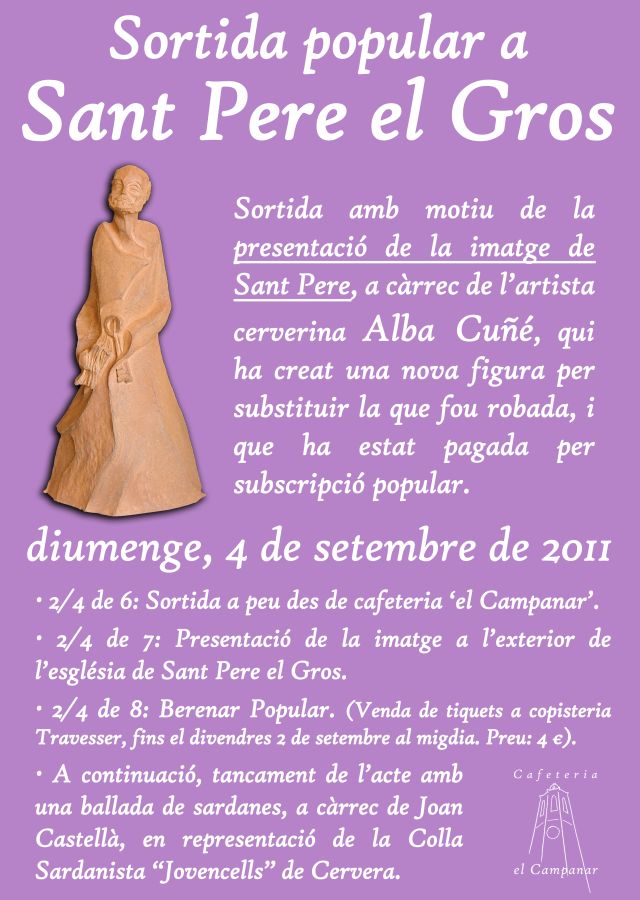 Tenint en compte que havien robat una còpia de la imatge del sant, ja que l’original està al Museu Comarcal, vam decidir endegar una subscripció popular per tal de que l’interior tornés a estar presidit per la figura de Sant Pere. Vam encarregar que fes l’escultura l’artista cerverina Alba Cuñé.
