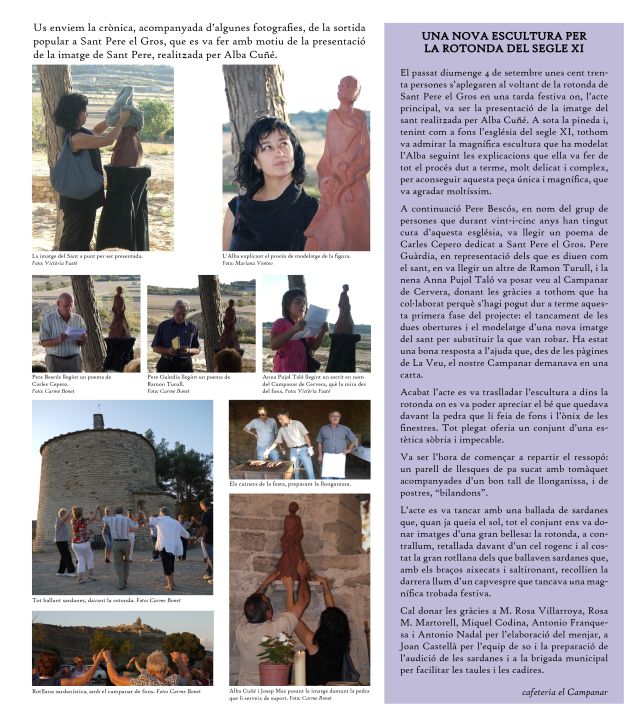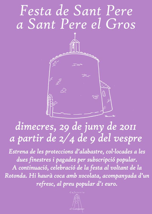 Des de l’Associació Cultural el Campanar hem estimat sempre Sant Pere el Gros. La rotonda i el seu entorn han estat escenari de moltes activitats que hem organitzat. Tenim la voluntat de convocar una sortida al Grau per explicar que, des de 1936, tot el conjunt és propietat de l’Arxiu Històric de Cervera. Ho farem perquè tothom entengui el que això representa. També es donarà a conéixer el projecte que hi ha sobre les actuals prospeccions arqueològiques sota la tutela de la Universitat de Lleida.